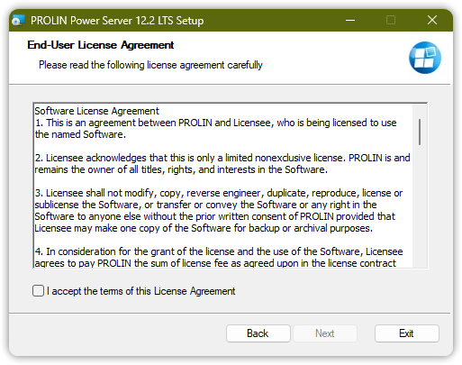 To install PROLIN Power Server, follow these steps: