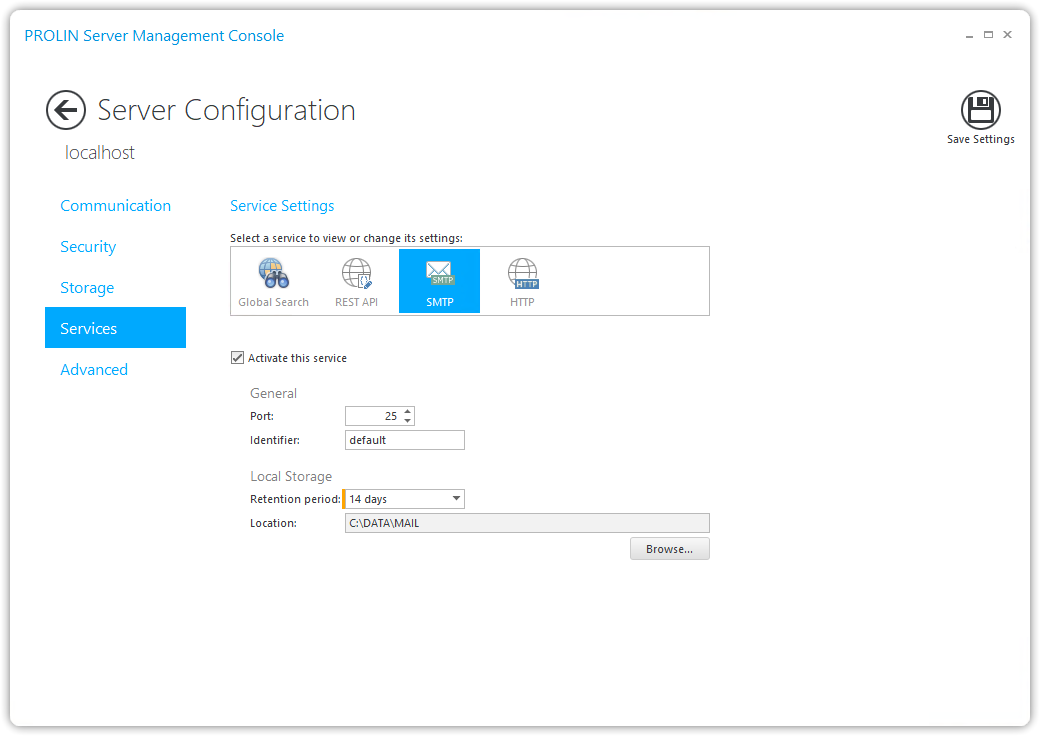 The SMTP service of PROLIN Power Server provides inbound e-mail handling capabilities based on the Simple Mail Transfer Protocol (SMTP).