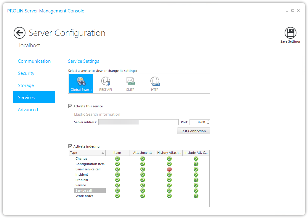 | Service address | The host address of the Elastic Search service in your environment. This is required when the Global Search service is activated. You can verify it by pressing the Test Connection button. |