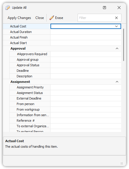 Updating items individually using forms can be tedious when you have a large number of items to modify. PROLIN Smart Client provides an efficient tool called Update All that allows you to apply the same change to multiple selected items at once.