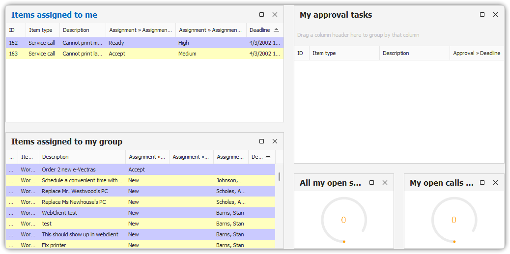 The Service Today View lists all items that can be assigned to a person or workgroup. These include: