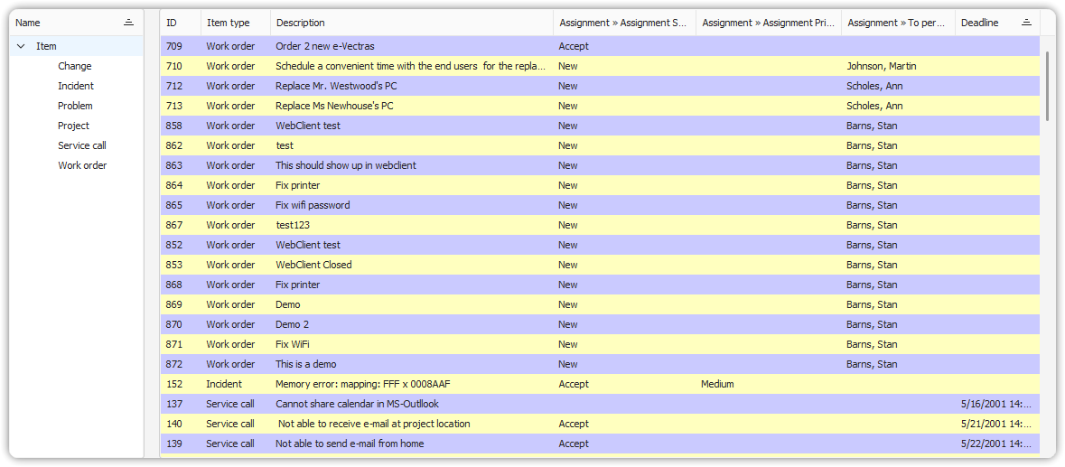 This view uses either a table or explorer layout. An Item Type column indicates the type of each item. When an item is opened, the appropriate form (e.g., Incident Form, Work Order Form) is displayed.