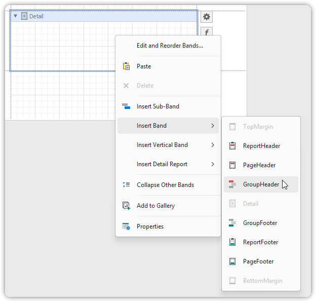 - In the Report Designer, insert a GroupHeader Band