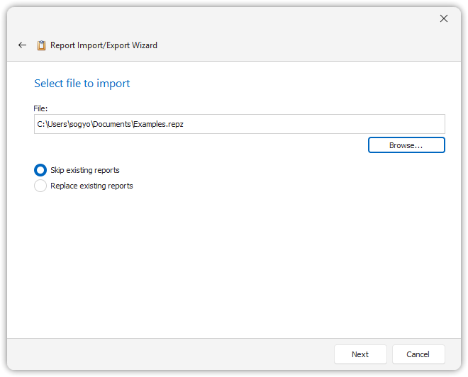 - Replace existing reports: Existing reports will be overwritten by the ones being imported