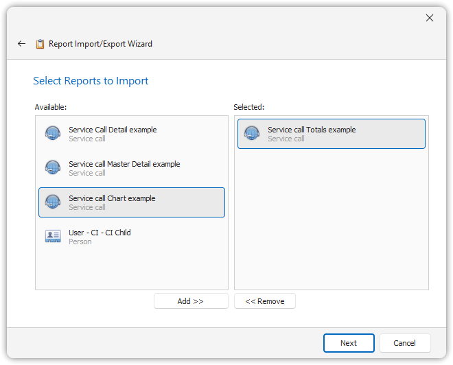 - Select the reports you want to import by clicking Add >>.