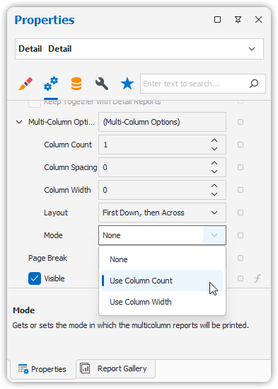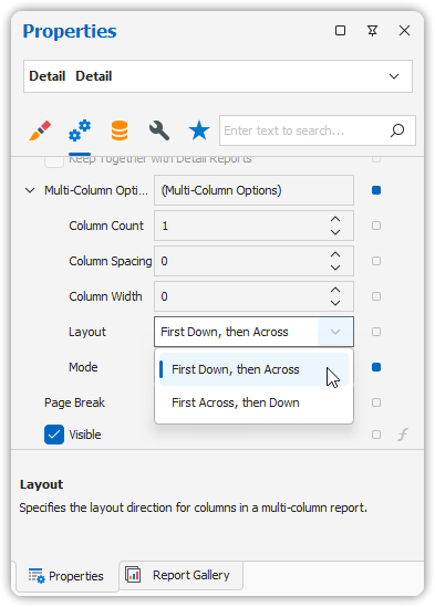 Detail Bandon the report surface. - In the Property Grid, expand the Multi-Column Options section.